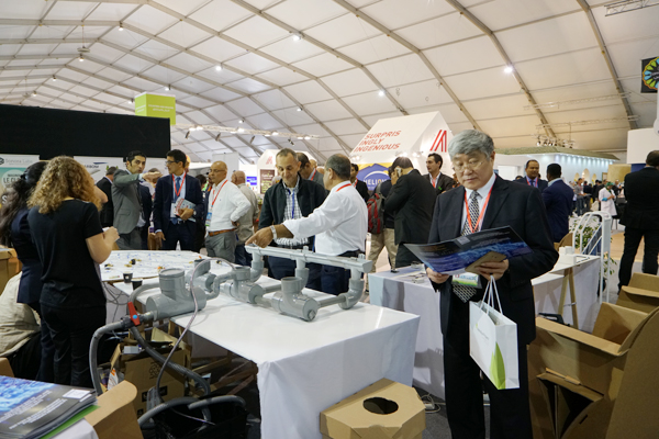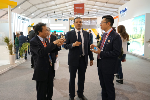 ??? 11月8日上午,在摩中商會(huì)、摩洛哥外貿(mào)銀行、香港匯盛資本等機(jī)構(gòu)負(fù)責(zé)人的陪同下,紀(jì)勤應(yīng)總經(jīng)理一行參觀了聯(lián)合氣候大會(huì)主展館。展會(huì)現(xiàn)場(chǎng)來(lái)自世界各地節(jié)能環(huán)保產(chǎn)業(yè)技術(shù)展示、部分獨(dú)具匠心的展臺(tái)設(shè)計(jì)展現(xiàn)出的世界各國(guó)實(shí)現(xiàn)綠色循環(huán)低碳發(fā)展,推進(jìn)清潔能源、可再生資源,應(yīng)對(duì)氣候變化、追求美好未來(lái)的決心等給考察團(tuán)一行留下了深刻的印象。